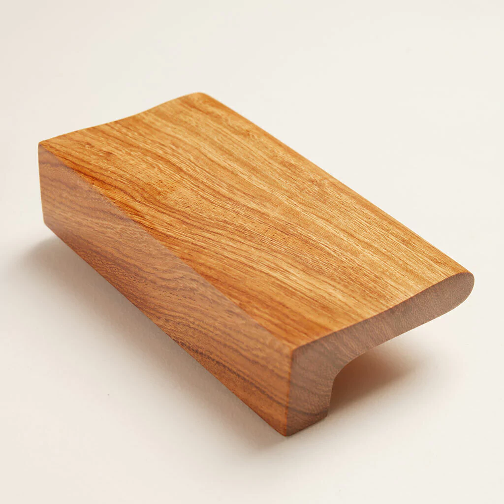 Puxador com design minimalista, torneado em madeira maciça variada.