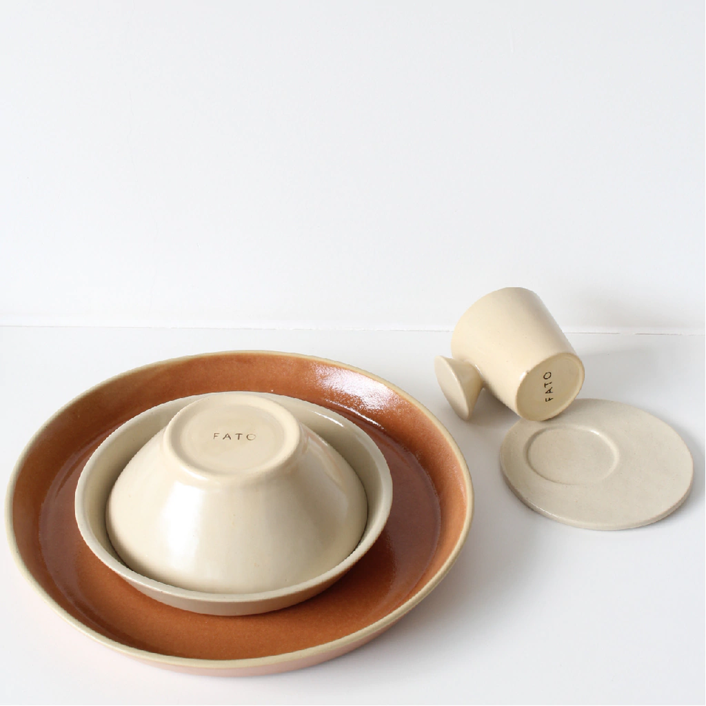 Xícaras e pires artesanais de alta temperatura, produzidos com barro marfim e esmalte transparente acetinado e terracota acetinado, ideal para o dia a dia e para ocasiões especiais.